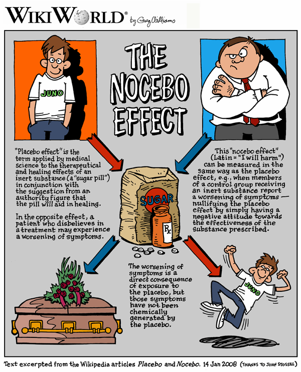 También existe el efecto contrario, el cual se llama efecto nocebo. Si pasamos por debajo de una escalera y pensamos que tenemos mala suerte, vamos a actuar con mucha desconfianza en nosotros mismos y vamos a ir por la vida con miedo, algo que va a causar que al final tengamos mala suerte de verdad. Si por ejemplo comenzamos un partido de fútbol pensando que lo vamos a perder, vamos a jugar muy mal y no nos vamos a esforzar, haciendo que lo que piensas en tu mente se vuelva real. Lo mismo ocurre con la gente de nuestro alrededor, la cual se aleja de nosotros no por la mala suerte, sino porque la gente con baja confianza en si mismos y en su entorno suele causar repulsión.