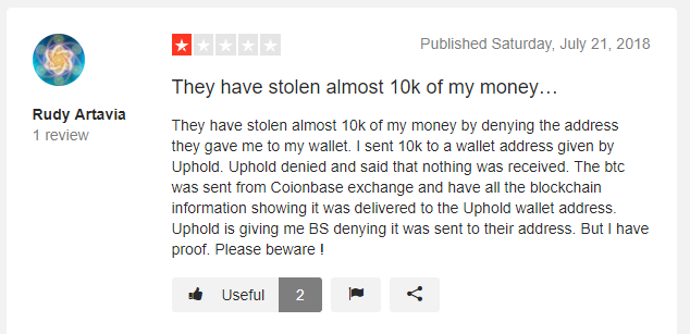 Un usuario asegura que Uphold le ha robado 10.000 dólares