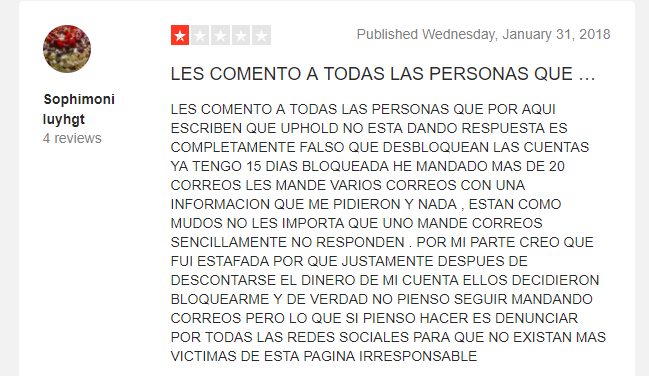 Al cabo de unos meses, me volvieron a bloquear la cuenta (por tercera vez). Realmente no quería seguir usando Uphold, pero quería saber la razón. Una mujer llamada Ivonne, me dio el soporte más lamentable que he recibido en mi vida. Era incapaz de dar una razón coherente al bloqueo de mi cuenta. Solo repetía como un robot «Ha incumplido los términos y condiciones». Tras innumerables emails, tickets, quejas etc.. conseguí hablar con otros miembros de soporte y la única razón que me pudieron dar es que «has usado tu cuenta personal por propósitos de negocios», lo cual es otro sinsentido, ya que precisamente te piden que verifiques tu negocio / fuente de ingresos para no bloquearte la cuenta.