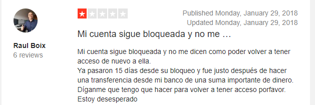 Lo primero que me llama la atención, es que cuando empecé a tener serias sospechas sobre esta empresa, cuando me bloquearon la cuenta por primera vez, con dinero, y además dejaron de responder durante 2 semanas, comencé a investigar y a buscar opiniones y experiencias de otras personas. Realmente me asusté mucho, ya que vi muchísimos comentarios negativos. De hecho, en una de las plataformas de reviews más conocida, su valoración era de 1 estrella y media sobre 5, vamos que la gran mayoría de las opiniones eran negativas. Para mi sorpresa, varios meses después, veo que tienen 4 estrellas. Evidentemente no puedo probarlo, pero estoy convencido de que algo muy raro ha pasado. Yo diría que han pagado por borrar comentarios negativos, o directamente están poniendo comentarios positivos ellos mismos para subir su valoración, sino no me explico cómo es posible que en 7 meses la valoración general de la empresa pase de ser pésima a muy buena. La empresa sigue teniendo un soporte pésimo y cero respeto por los clientes, como siempre, así que lo que es seguro, es que su mejora en la valoración, no viene de una mejora del servicio.