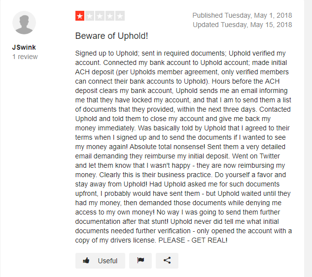 Tenia tres años con ellos hace un mes me pusieron en revisión no puedo retirar pero si mover internamente … me pidieron actualizar los datos lo hice kyc envié documentos . Me dijeron absurdamente que con mi número tenía varias cuentas de uphold … creo esa gente tiene ese modus operandi..para usar el dinero de la gente e invertirlo.